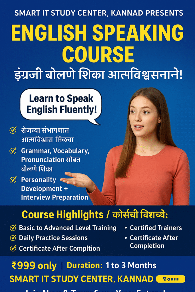 Smart IT Study Center, Kannad (Maharashtra), is a leading training hub offering **government-approved, skill-oriented courses**. Our mission is to make education accessible to everyone — **“Shika ani Kamwa” (Learn and Earn)** — through affordable, high-quality digital learning.